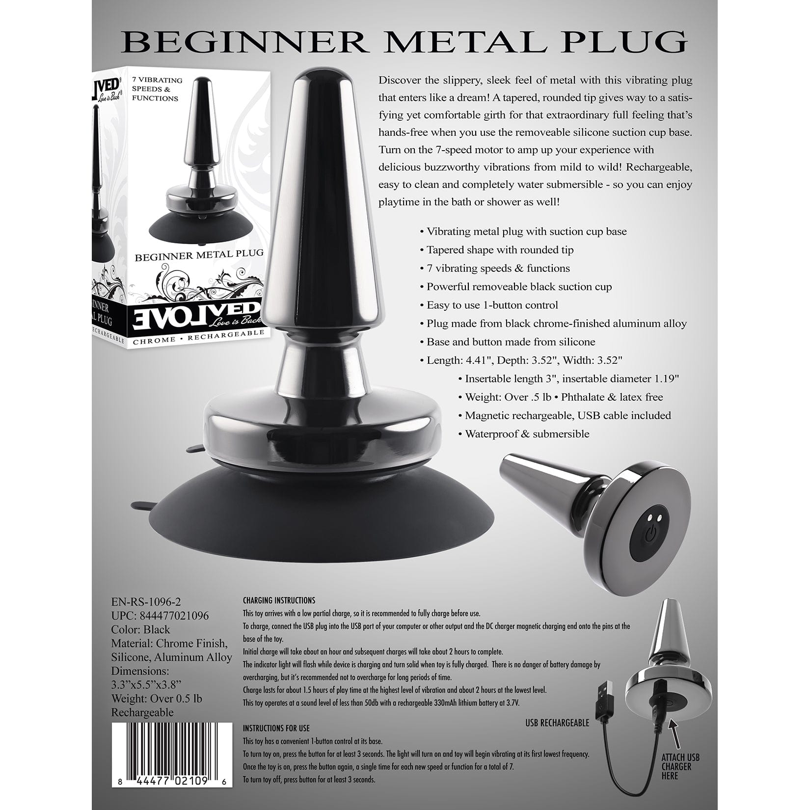 Ready to explore the tantalizing sensations of anal play? Take your backdoor pleasure to the next level with the Evolved Beginners Vibrating Metal Anal Plug with Suction Cup. Made of sleek, chrome-finished aluminum alloy, this plug offers a tapered shape with a rounded tip for comfortable insertion and a satisfyingly full feeling. Enjoy 7 speeds and functions of delicious vibration with simple one-button control, and use the powerful suction cup base to attach the plug to any surface to keep your hands free from other activities. The rechargeable plug is waterproof and submersible, can easily be cleaned, and is phthalate and latex free. Let the waves of pleasure take you away on a journey of luscious anal delight!
