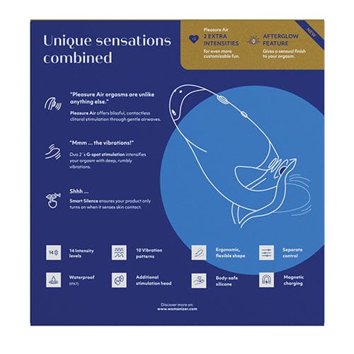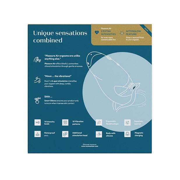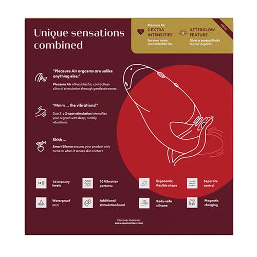 Experience the ultimate pleasure with the Womanizer Duo 2, a premium rabbit toy designed to deliver advanced, blended orgasms. Combining the innovative Pleasure Air clitoral stimulator with a powerful G-Spot vibrator, the Duo 2 offers a new kind of extraordinary pleasure.