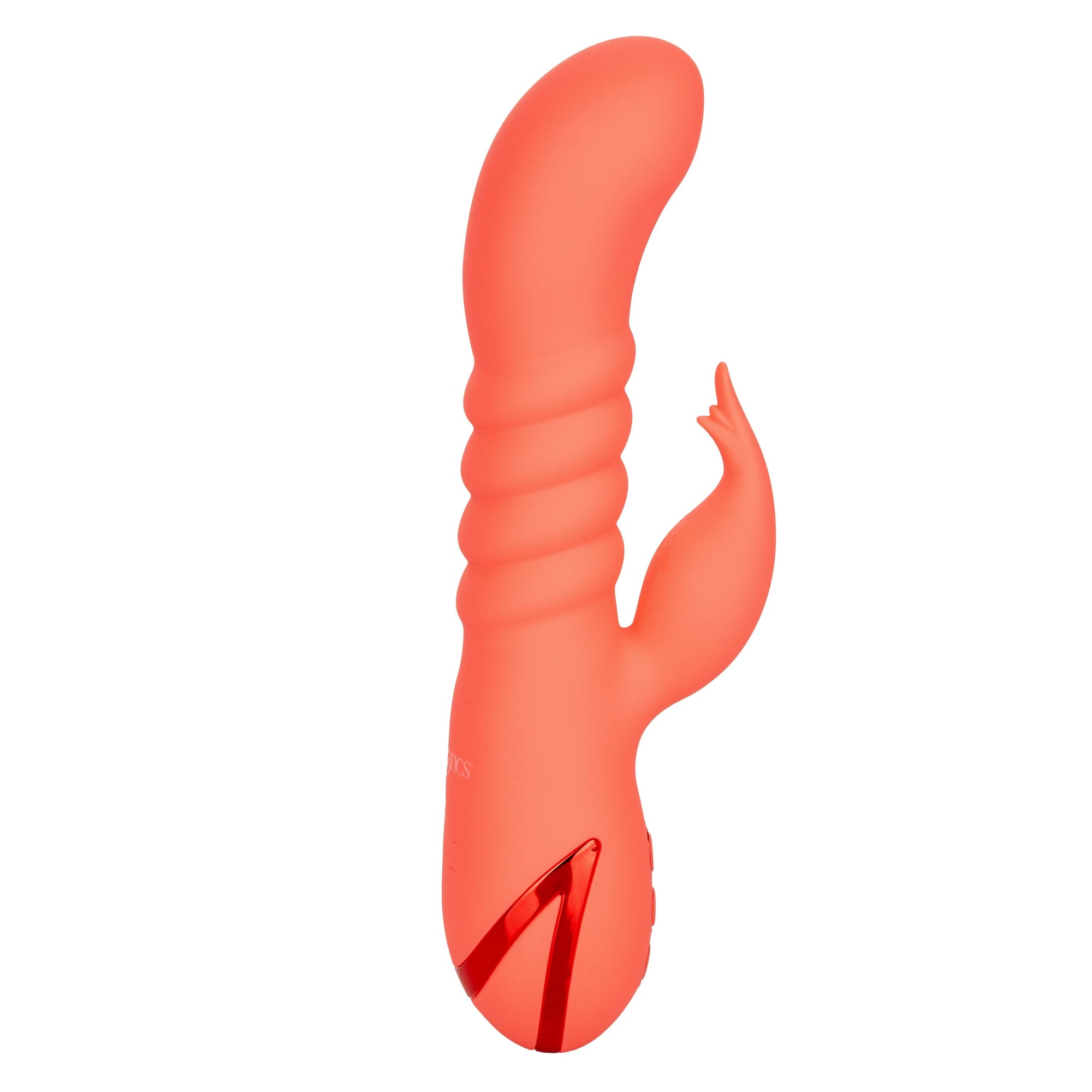 Experience ultimate pleasure with the California Dreaming™ Orange County Cutie Rabbit Vibrator. This vibrant, ergonomically designed massager is a perfect blend of luxurious fantasies and powerful performance. The Orange County Cutie features intense vibration functions and thrilling thrusting speeds, crafted to deliver unmatched stimulation. Its ribbed shaft and curved tip are engineered for deep, G-spot stimulation, while the powerful back-and-forth action ensures precise targeting of your pleasure zones. The flickering stimulator offers blissful external sensations, with a flexible design that allows for independent use from the thrusting function, giving you fully customizable pleasure. The sleek 3-button control pad allows you to independently operate vibration and thrusting functions, while the high-tech memory chip resumes your last used settings for effortless enjoyment. Elevate your pleasure experience and embrace your fantasies with this exquisite rabbit vibrator.
