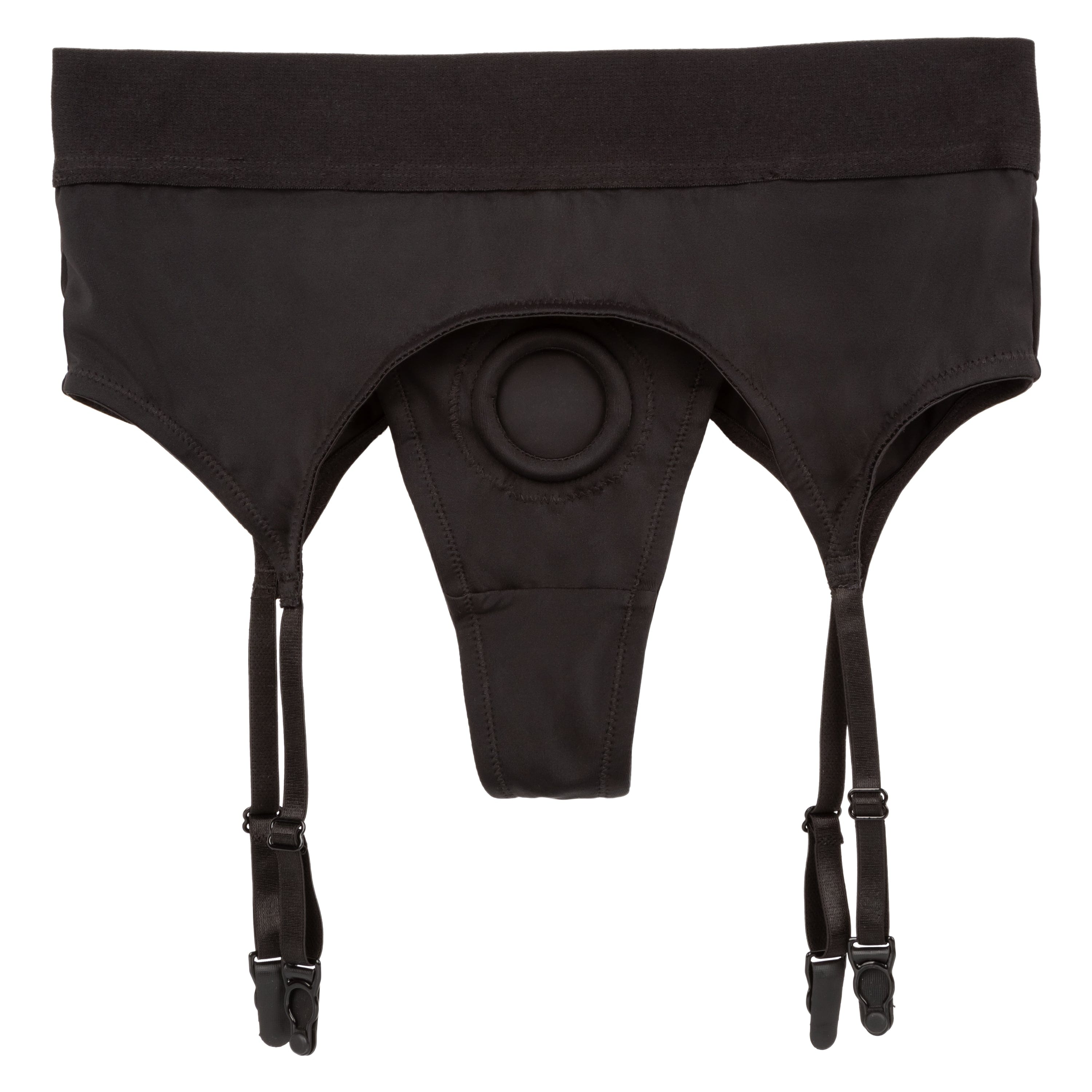 Get that sexy look with the California Exotics Boundless Thong with Garter Strap On. The Boundless™ Thong with Garter is an ultra-comfortable harness fashioned like a risqué backless brief with powerful performance and comfort in mind. This bold harness has an extra-wide waistband, unique garter belt design and reinforced O ring for the ultimate support. The thong design is comfortable, with a stretchy O-ring in the front to accommodate your favorite packer, vibrator or dildo. The sensual garter belt is complete with adjustable straps for a sexy, yet comfortable fit. Enjoy pleasure made for two with the double panel interior for easy access to your favorite probe. It's perfect for packing, pegging, or playing with a vibrator. You can wear it for hours, then enjoy an easy cleanup. So slip it on and explore!