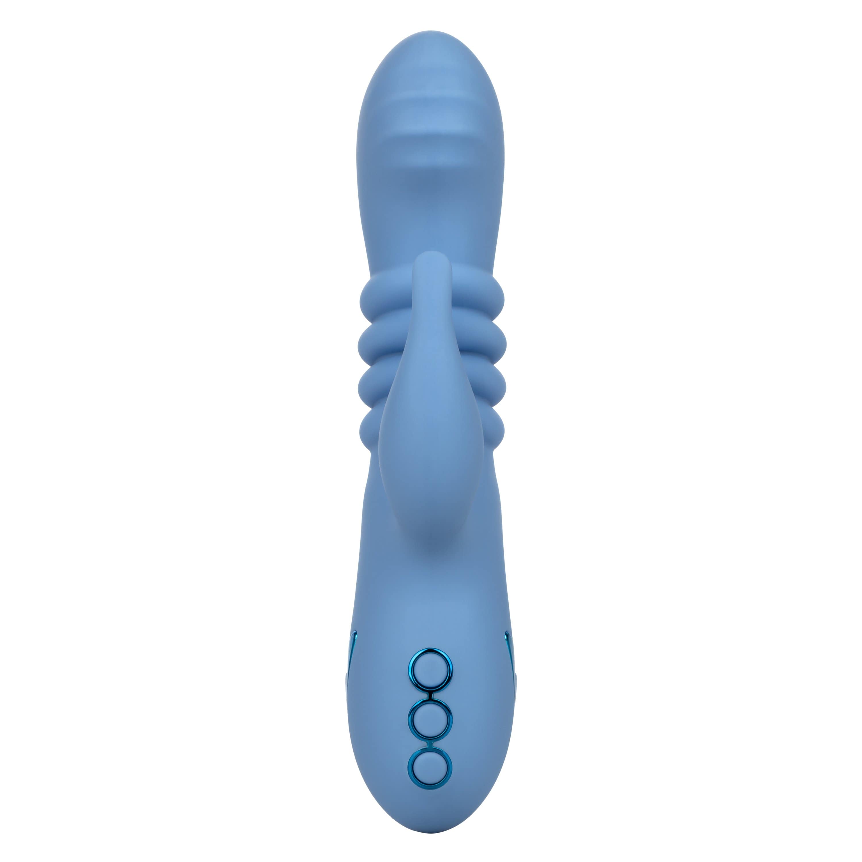 The rabbit still reigns supreme when it comes to sex toys, as does manufacturer California Exotics! This modern blue bunny features fluttering ears for clitoral stimulation and an intensely ridged shaft with a contoured head that also thrusts to hit all the right spots inside! The shorter shaft and medium girth make this toy perfect for beginners! You've got plenty of time to experiment with the different vibrations thanks to the rechargeable motor. Plus, it's waterproof!