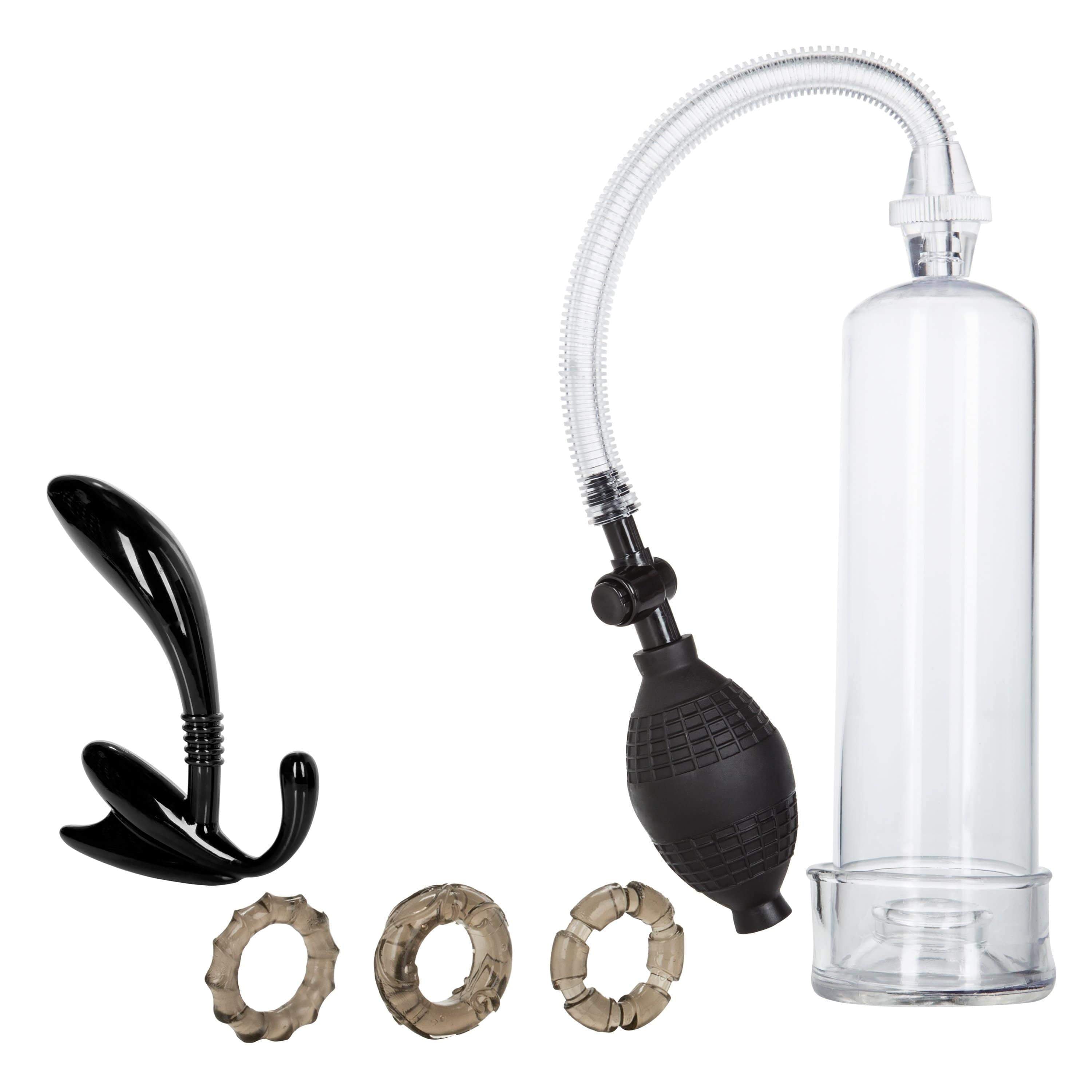 The Dr. Joel Kaplan Essential Penis Pump Kit includes everything required for a rewarding pumping session. This all-inclusive system includes a crystal clear cylinder pump, 3 stretchy cock rings, and a curved prostate probe. Watch your length increase as you pump. A quick air-release feature breaks the seal after peak suction has occurred. Designed for your pleasure, each cock ring has a different texture. Your length and girth will have your partner screaming in ecstasy.