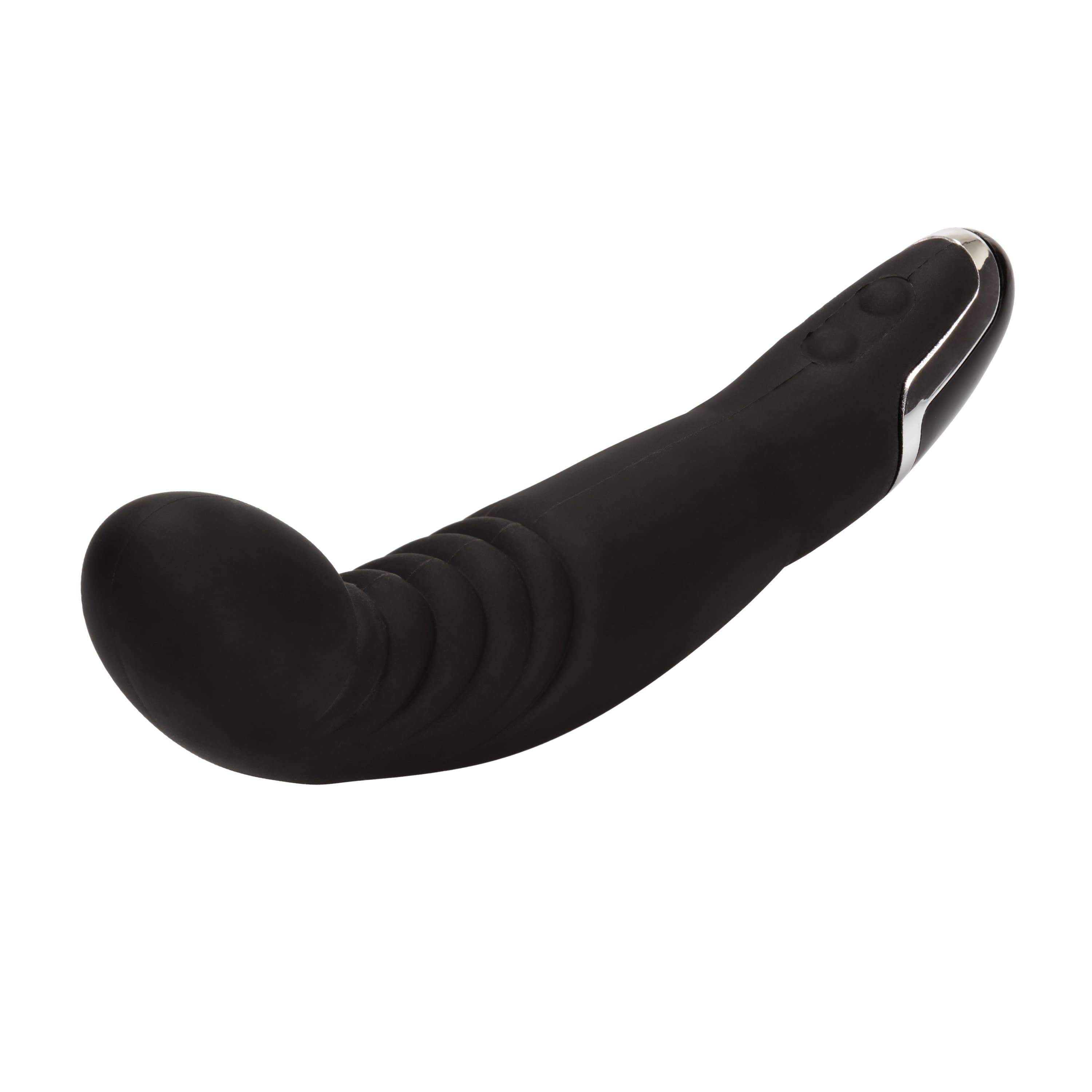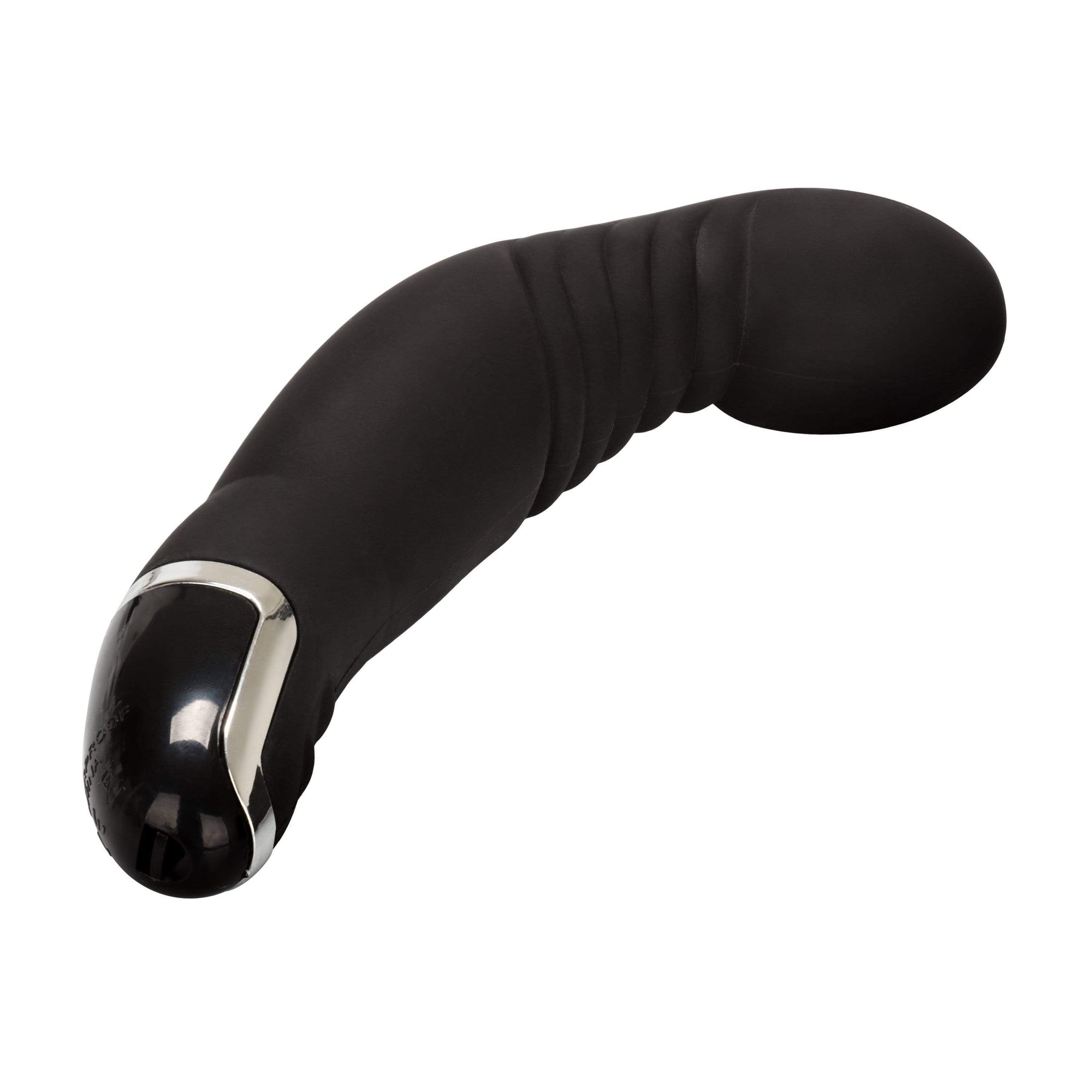 Experience the Dr Joel Kaplan Silicone Ridged P Prostate Massager in bodacious black. It posses 8 powerfully intense pulsation, vibration, and escalation functions and a memory chip that retains your favorite function. This perfectly curved massager is crafted from smooth, phthalate-free silicone, with ABS silver plating décor. The contoured shaft features sensual pleasure ridges, angled precision tip, and simple push-button controls. It's totally waterproof, for provocative play anywhere, anytime! The massager measures a generous 6.25” x 1.5”/16 cm x 3.75 cm. Brought to you by California Exotics.