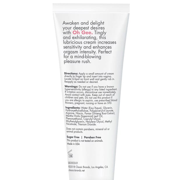Make your G Spot orgasm even more intense with the Classic Erotica CGC Oh Gee G Spot Stimulant Arousal Gel. This fun, tingly gel applies directly over the G Spot, making the nerve endings more sensitive and increasing your arousal. This leads to more exciting foreplay and a thrilling climax! CG's "Oh Gee" G-Spot Gel is formulated to be applied directly to the G-spot to deliver an exhilarating tingly sensation that will truly intensify your pleasure and orgasms. "Oh Gee" G-Spot Gel is fragrance-free, sugar-free, paraben-free, and made in the USA.