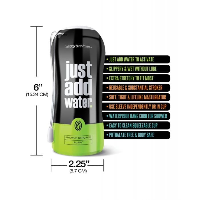 Introducing the Happy Ending Just Add Water Shower Stroker Pussy Cup Masturbator (Tan)! This reusable stroker is designed to get you off in a hurry, no lube required. Just a few drops of water will give you the slippery sensation you crave. Its extra stretchy design fits most and its soft and tight texture adds to the lifelike feeling. You can either use the sleeve independently or in the cup, whichever you prefer. Plus the waterproof hang cord makes it perfect for shower use. Cleanup is easy with just soap and water. Get ready for a happy ending with the Happy Ending Just Add Water Shower Stroker Pussy Cup Masturbator (Tan)!