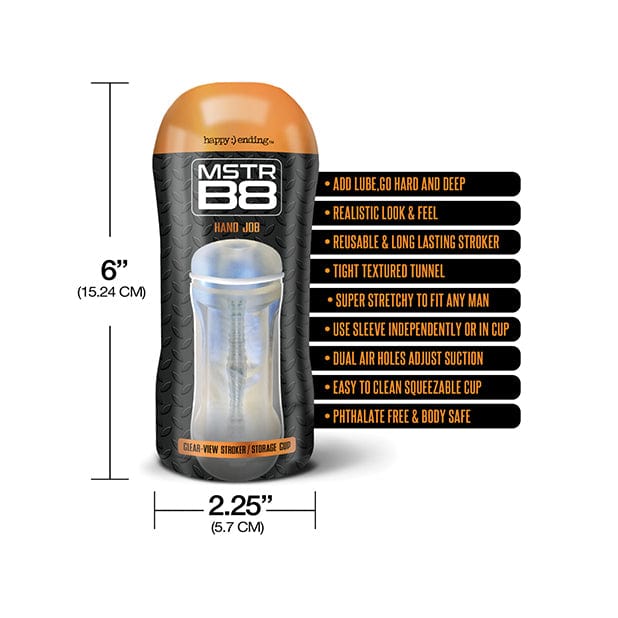 Introducing the Happy Ending MSTR B8 Hand Job Clear View Stroker Cup Mastubator! This revolutionary stroker cup is designed to give you the ultimate pleasure experience. It features a super-stretchy, textured tunnel that is tight and brings you maximum sensation. It's waterproof and phthalate-free, so you can enjoy it in the shower or bath without worry. The clear-view design means you can see every stroke as you slide in and out for a truly thrilling experience. The reusable and long-lasting design ensures you get your money's worth every single time. Plus, you can use the sleeve independently or in the cup for added convenience. Clean-up is easy, just use warm water and mild soap. Get ready for some explosive pleasure with the Happy Ending MSTR B8 Hand Job Clear View Stroker Cup Mastubator!
