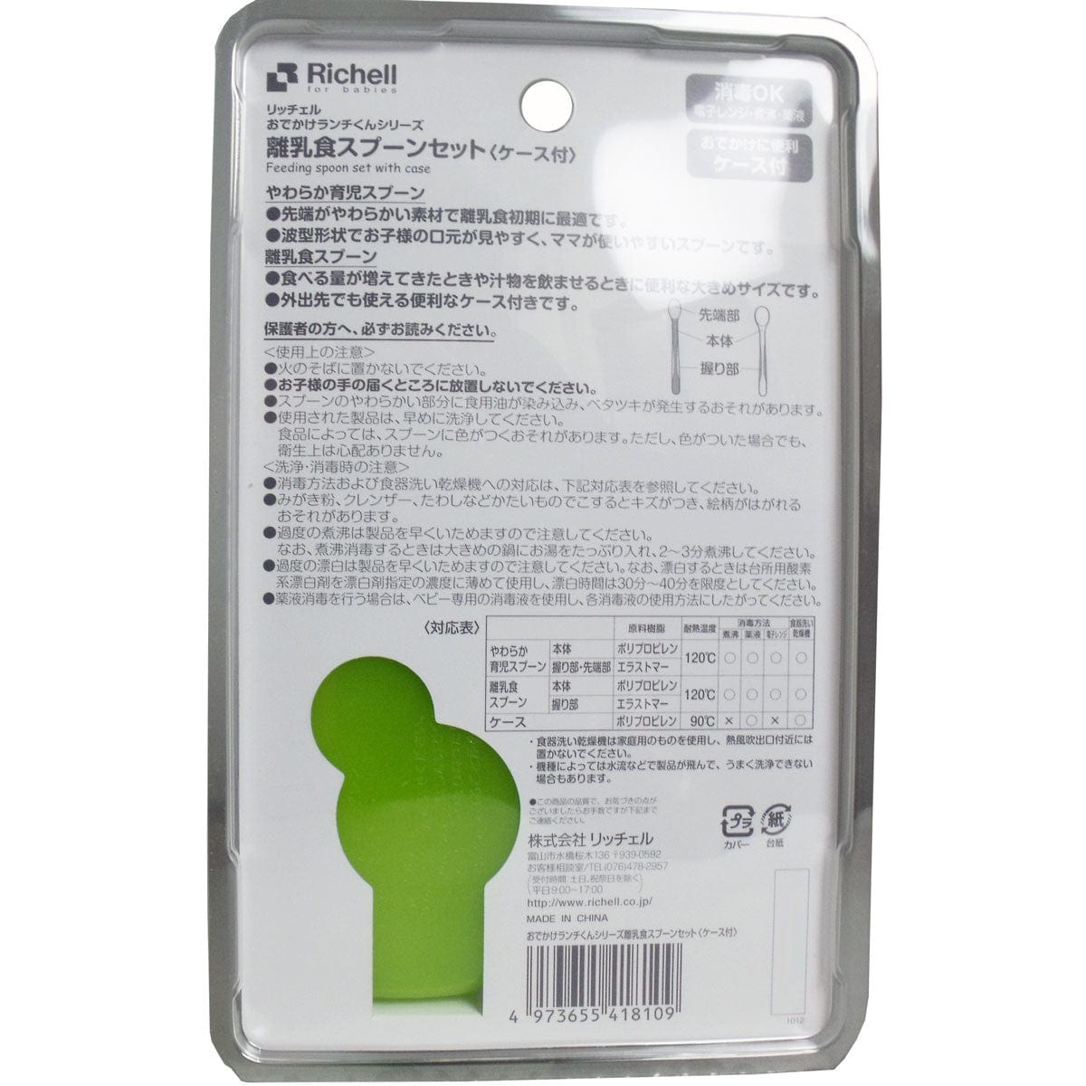 [Material] - Baby Food Spoon: Polypropylene (Main body), Elastomer (Grip) - Soft Childcare Spoon: Polypropylene (Main body), Elastomer (Tip/Grip) - Storage Case: Polypropylene