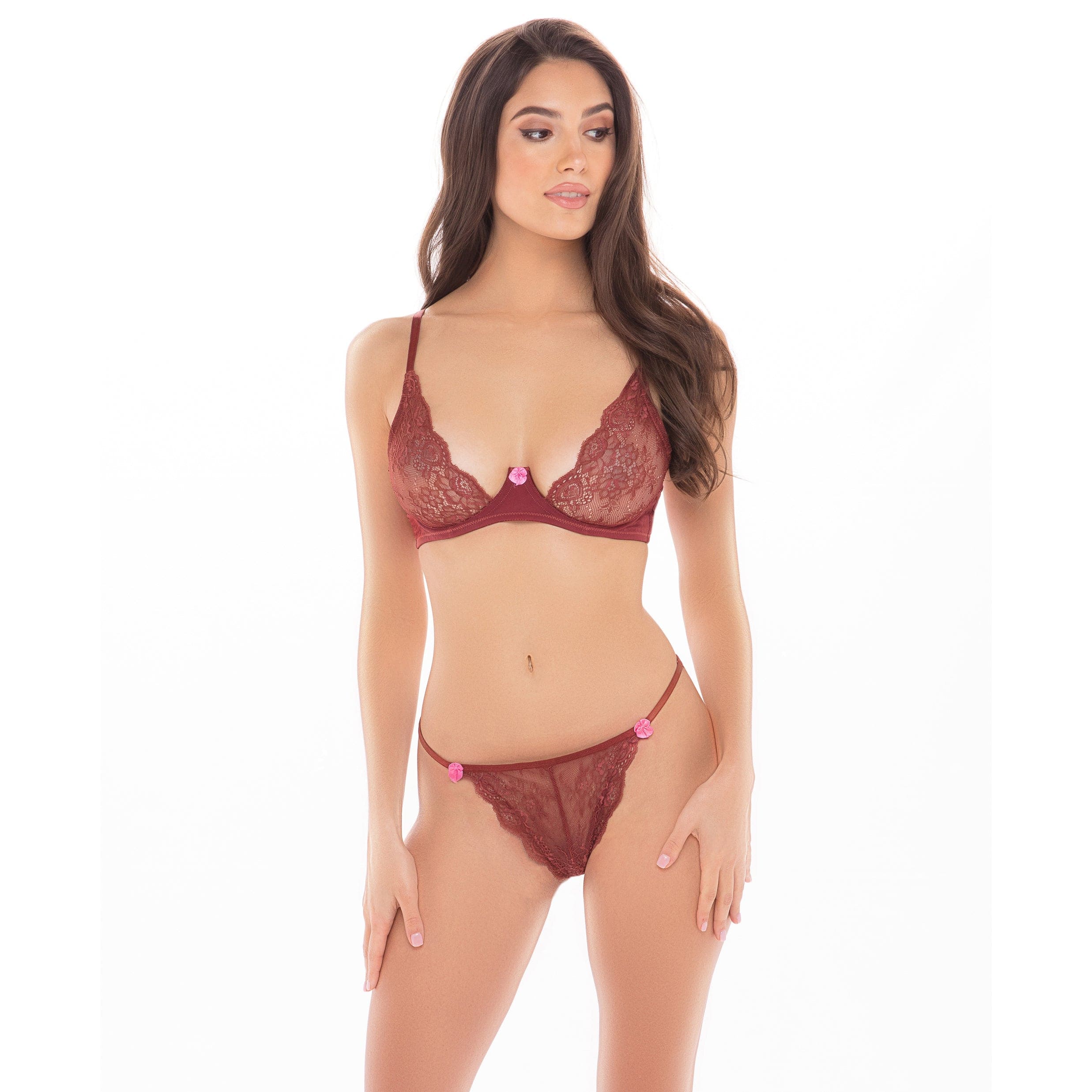 Staying In Lingerie สองชิ้นเบอร์กันดีที่จัดทำโดย Rene Rolf เพิ่มสัมผัสของลูกไม้ให้กับมุมมองที่เซ็กซี่อย่างไม่น่าเชื่อ เสื้อชั้นในและกางเกงชั้นในแบบจีสตริงเน้นลายดอกไม้สีชมพู เสริมฐานลูกไม้เบอร์กันดี เหมาะกับหน้าอกตั้งแต่ 34 ถึง 38 นิ้ว คัพ B และ C รอบเอว 26 ถึง 30 นิ้ว และสะโพกตั้งแต่ 36 ถึง 40 นิ้ว ผลิตจากไนลอน 90% และสแปนเด็กซ์ 10%
