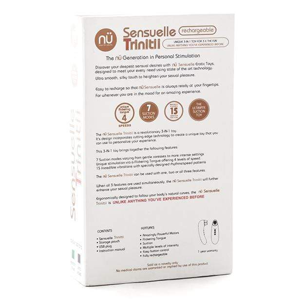 Sensuelle Trinitii 阴蒂吸力 - 7 种模式。闪烁舌头 - 4 种速度。强烈振动 - 15 种模式。超光滑、丝般柔软。 USB可充电。